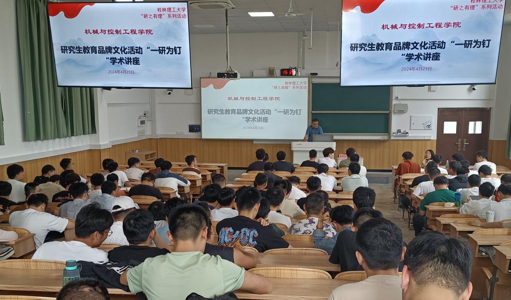 学院于4月23日下午在06206教室举办了桂林理工大学“研之有理”系列活动之“一研为钉”学术讲座,旨在激发学生的科研兴趣,增强论文写作能力。本次讲座由学院机械教研室主任易怀安老师主讲,研究生辅导员刘培培以及一百五十余名在校研究生参加。