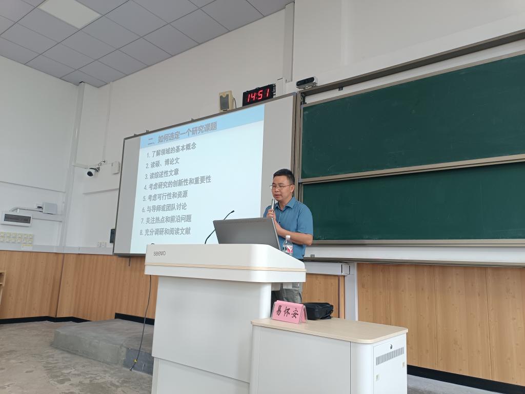 易怀安老师长期从事学术研究,科研成果丰硕,曾主持多项国家级省级科研项目,并在高水平期刊上发表多篇学术论文,积累了丰富的写作经验。作为研究生导师,易老师指导的研究生考取博士研究生,经验丰富。在讲座中,易怀安老师围绕“研究领域”、“研究课题”、“撰写论文”以及“研究生学习生涯规划”等方面进行了深入浅出的讲解,分享了学术研究的意义和方法。他特别强调兴趣是最好的老师,建议学生结合研究前景和个人职业规划选择适合自己的研究领域和课题。在论文撰写方面,他强调创新性最为重要,鼓励学生关注科研发展的热门方向,通过阅读前沿文献,抓住研究的创新点。他还强调了研一、研二阶段打好科研基础的重要性,为研三申请博士考核打下基础。易老师还强调了端正的科研态度的重要性,实事求是的态度和不懈的探索精神对学生的科研之路至关重要。