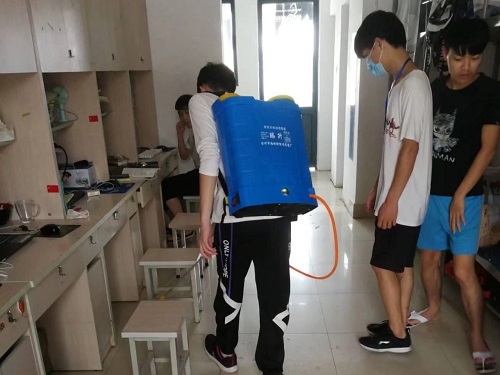 活动当天,志愿者们佩戴好工作牌、口罩、拿着收集袋前往自己所负责的楼层回收废品,并在整理废品后对宿舍进行清洁与消毒,重点对厕所、阳台、洗手池和门把手等容易滋生细菌的地方进行消毒,并提醒同学们经常通风。废品回收与消毒工作同时进行,志愿者们认真开展活动并及时在活动后交流总结。