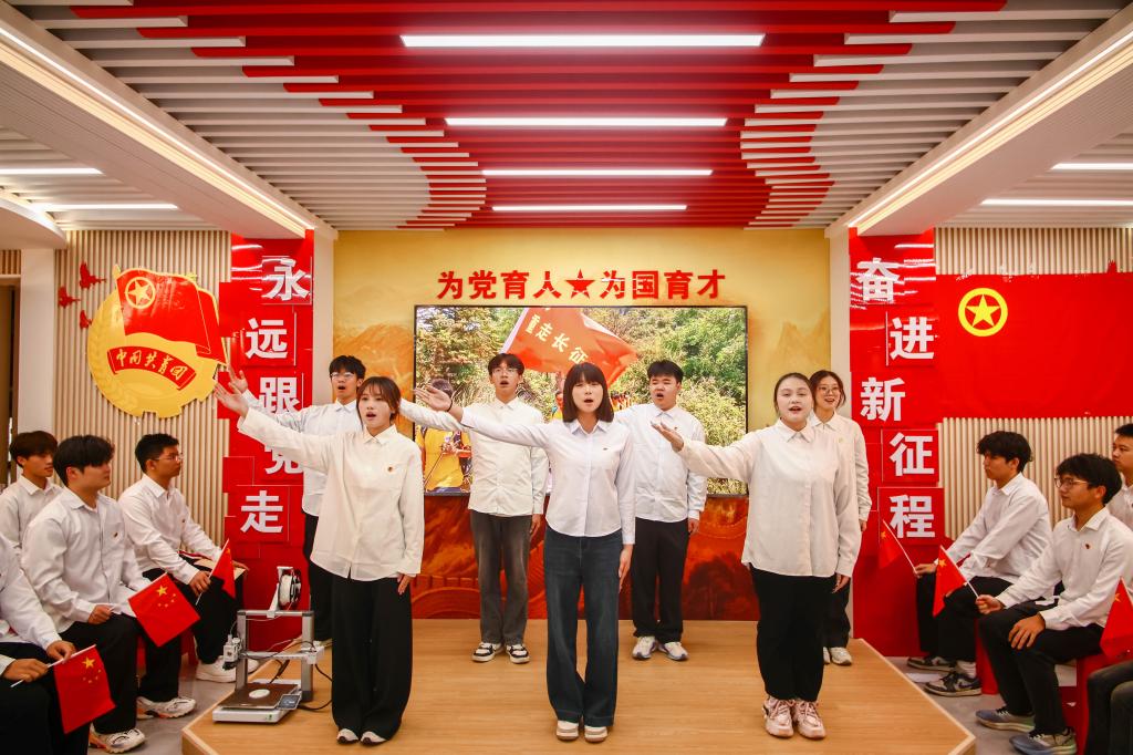 活动尾声,团员青年合唱校歌《桂林理工大学之歌》。“七星叠翠,漓水流长,屏风紫气蔚霞光……”嘹亮的歌声中,爱校之情与报国之志交织成澎湃的乐章。随后,大家面向团旗庄严宣誓,重温入团誓词。铿锵有力的誓言,是青春的承诺,更是奋进的号角。