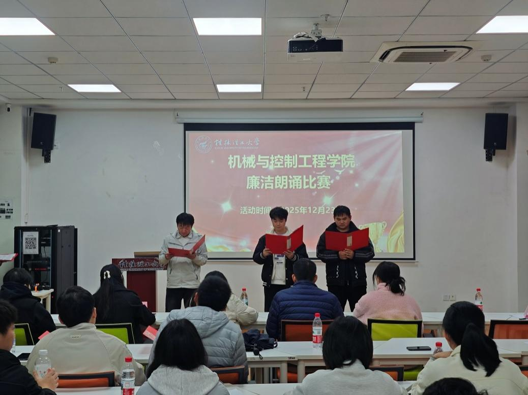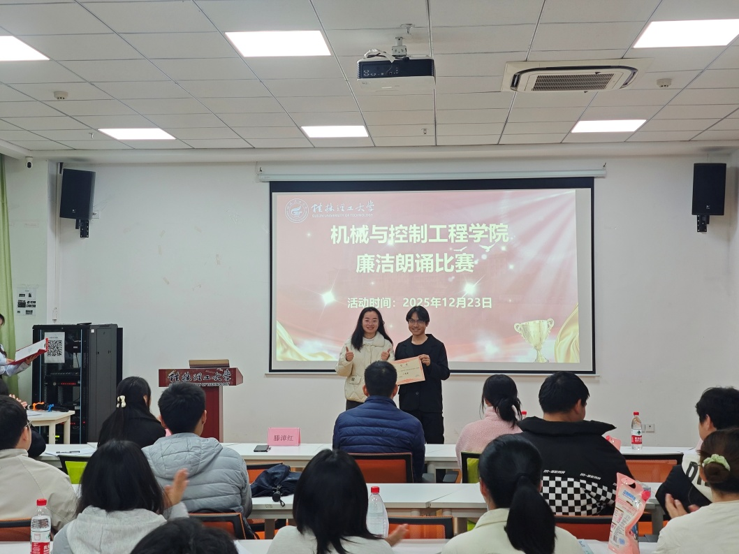 2025年12月23日晚上,学院在15205教室成功举办桂林理工大学“研之有理”系列活动之“一研为钉”廉洁主题朗诵比赛暨颁奖典礼。活动旨在以朗诵艺术为载体,深植廉洁文化根脉,强化研究生廉洁自律意识,涵养学院风清气正的学术生态。学院研究生辅导员滕漳红、2024级辅导员韦华泽及兼职辅导员担任评委,80余名研究生代表到场观摩。